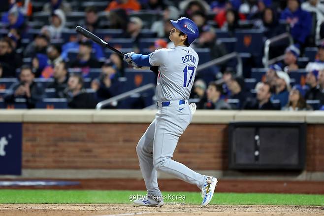 오타니는 17일(한국시간) 미국 뉴욕주 플러싱 시티필드에서 열린 뉴욕 메츠와의 2024 MLB 내셔널리그 챔피언십시리즈(NLCS·7전 4승제) 3차전에서 1번·지명타자로 선발 출장했다. 7회까지 나선 4타석에서 안타 없이 볼넷 1개만 기록했던 오타니는 다저스가 4-0으로 앞선 8회 초 1사 1·2루에서 상대 투수 타일러 매길의 컷 패스트볼(커터)를 공략해 오른쪽 폴 근처를 지나 외야석에 떨어지는 스리런홈런을 쳤다. 판독 결과 홈런이 인정됐다.