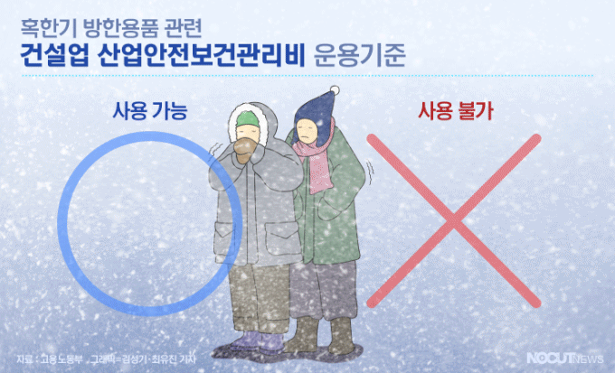 주의할 점은 일시적 한파를 사유로 장기 사용이 가능한 작업복을 마련하는 데 안전관리비를 쓰면 안된다는 겁니다. 지난해 6월 시행한 고용부의 '건설업 산업안전보건관리비 계상 및 사용기준' 개정고시안에 따르면, 이전과 달리 목토시, 방한용 귀덮개, 귀마개, 방한모, 방한화 등이 안전보건관리비 사용 불가 품목에 포함됐습니다.