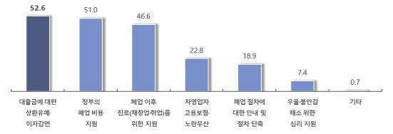 폐업 시 가장 필요한 정부 정책으로는 대출금 상환 유예·이자 감면, 폐업 비용 지원, 진로 지원, 자영업자고용보험·노란우산공제 확대 등이 꼽혔다.