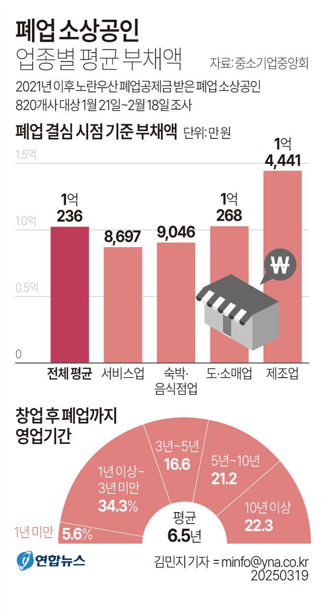 연합뉴스 보도에 따르면 중소기업중앙회는 지난 1월 21일부터 2월 18일까지 2021년 이후 노란우산 폐업공제금을 받은 폐업 소상공인 820개 사를 대상으로 실태조사를 한 결과 이들 소상공인의 창업 후 폐업까지의 영업 기간은 평균 6년 6개월로 집계됐다고 19일 밝혔다.