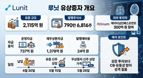 17일 금융감독원 전자공시시스템에 따르면 루닛은 주주배정 후 실권주 일반공모 방식으로 보통주 790만6816주를 발행, 2115억원을 조달할 계획이다. 납입일은 4월30일이고 유증 신주는 5월15일 상장된다. 이와 함께 5월6일을 기준으로 1대1 무상증자도 진행해 5월26일 신주를 상장할 예정이다. 운영자금 737억원, 채무상환자금 1378억원, 발행제비용 24억원으로 나뉜다.
