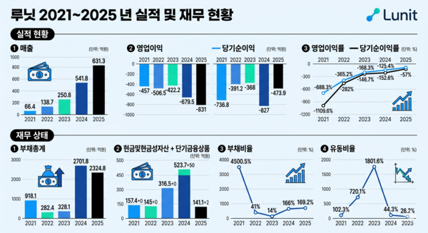 루닛이 이번 증자에 나선 배경으로는 이미 취약해진 유동성이 지목된다. 부채비율이 2023년 14%에서 2025년 169.2%까지 높아지는 동안 유동비율은 1801.6%에서 26.2%로 낮아졌다. 현금 및 현금성자산은 2023년 317억원에서 2024년 524억원까지 늘었지만 2025년 141억원으로 다시 줄었다. 단기금융상품도 2023년 0원, 2024년 50억원, 2025년 2억원의 흐름을 보였다.