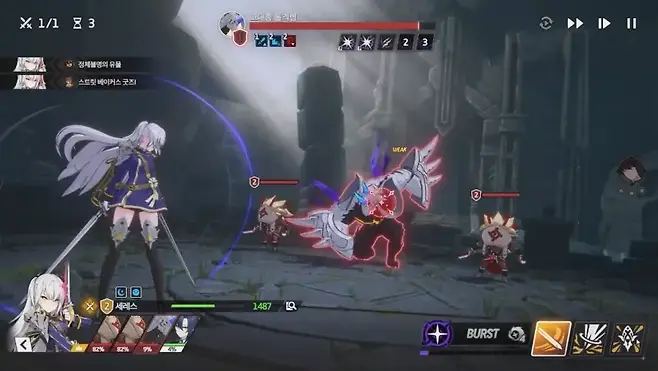 적을 브레이크하면 브레이크 포인트가 1씩 쌓이고, 이 포인트가 3개 쌓이면 유저 특수 스킬인 '브레이크 스킬'을 사용할 수 있게 됩니다. 브레이크 스킬은 단순히 광역딜 외에도 생명력 흡수 같은 유용한 버프도 제공하는 만큼, 적절히 사용해 위기를 모면하는 수가 되기도 합니다. 브레이크 스킬은 아군 턴에 사용할 수 있으며, 추가 턴 개념이라 이를 사용하고 난 뒤 바로 그 캐릭터의 턴으로 다시 돌아옵니다.