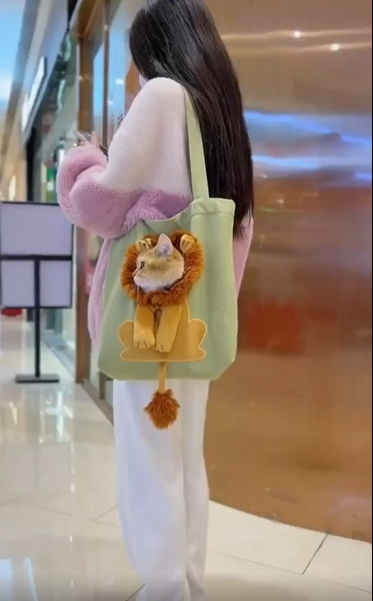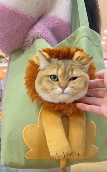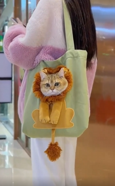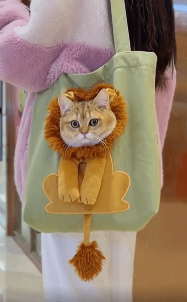 가방 하나가 눈길을 끌었습니다. 흰색 천으로 된 그 백에는 커다란 사자의 얼굴이 인쇄되어 있었고, 그 중심부—바로 코와 입 부분—엔 뭔가 작은 구멍이 나 있었습니다. 처음엔 단순한 프린팅처럼 보였죠. 그런데 다음 순간, 그 구멍에서 뭔가 둥글고 부드러운 것이 천천히 모습을 드러냈습니다. 회색 얼룩무늬 고양이의 얼굴이었어요. 그것도 기가 막히게 사자의 코에 정확히 들어맞는 위치에서 말이죠.