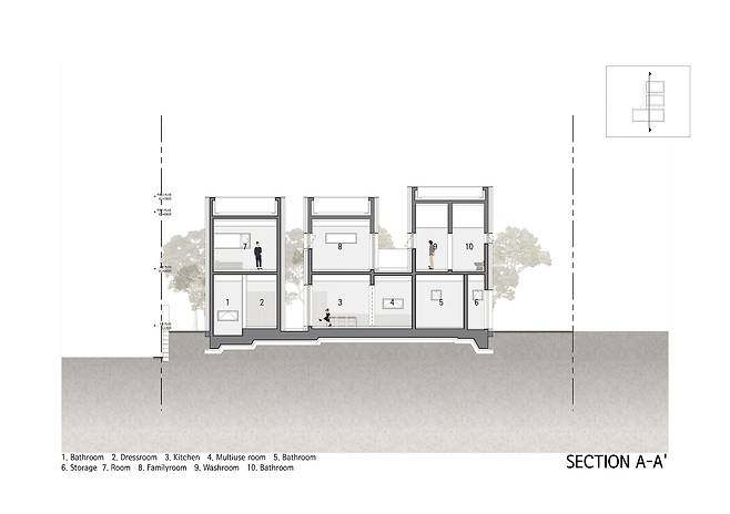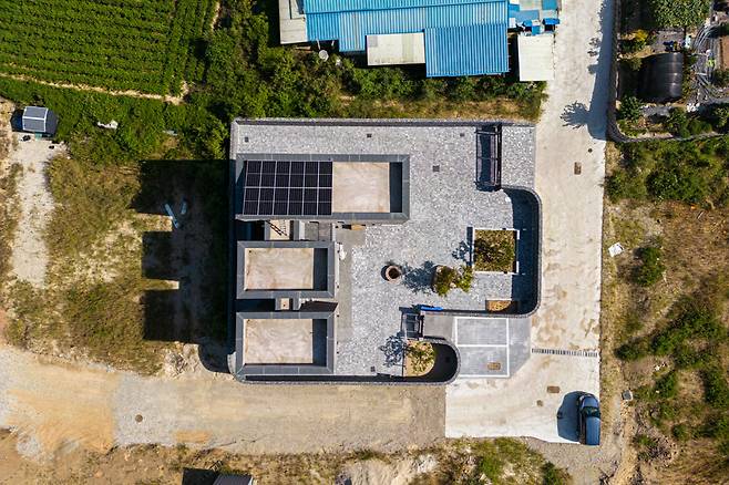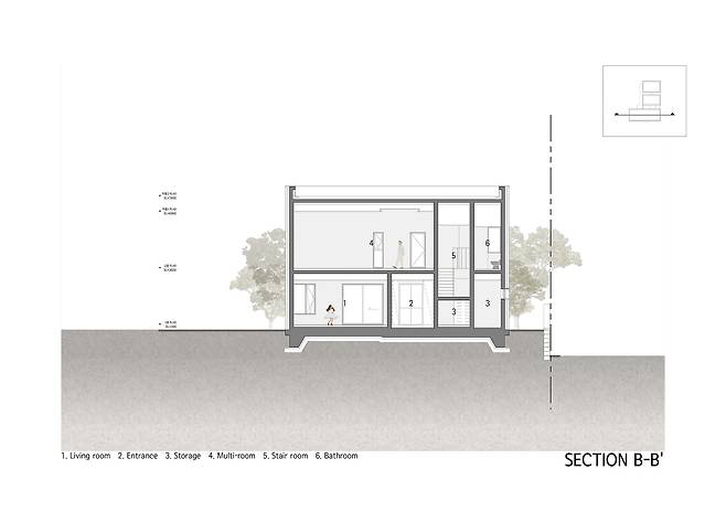 계획은 공간 이용자를 건축주 부부와 손님으로 구분하는 데 중점을 두었다. 외부는 손님의 주차 영역을 옹벽 아래에, 건축주의 주차를 건물 옆에 계획하여 불필요한 동선 없이 바로 현관 출입이 가능하게 해 편의성을 확보하였다. 내부 또한 현관에서 가장 가까운 곳에 손님과 함께하는 공간을, 가장 안쪽에 사적인 침실 영역을 두어 의도적으로 공간 사이의 위계를 조성했다.
