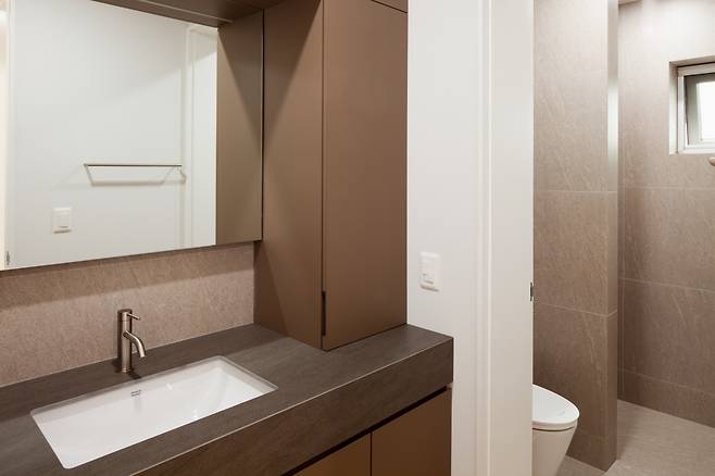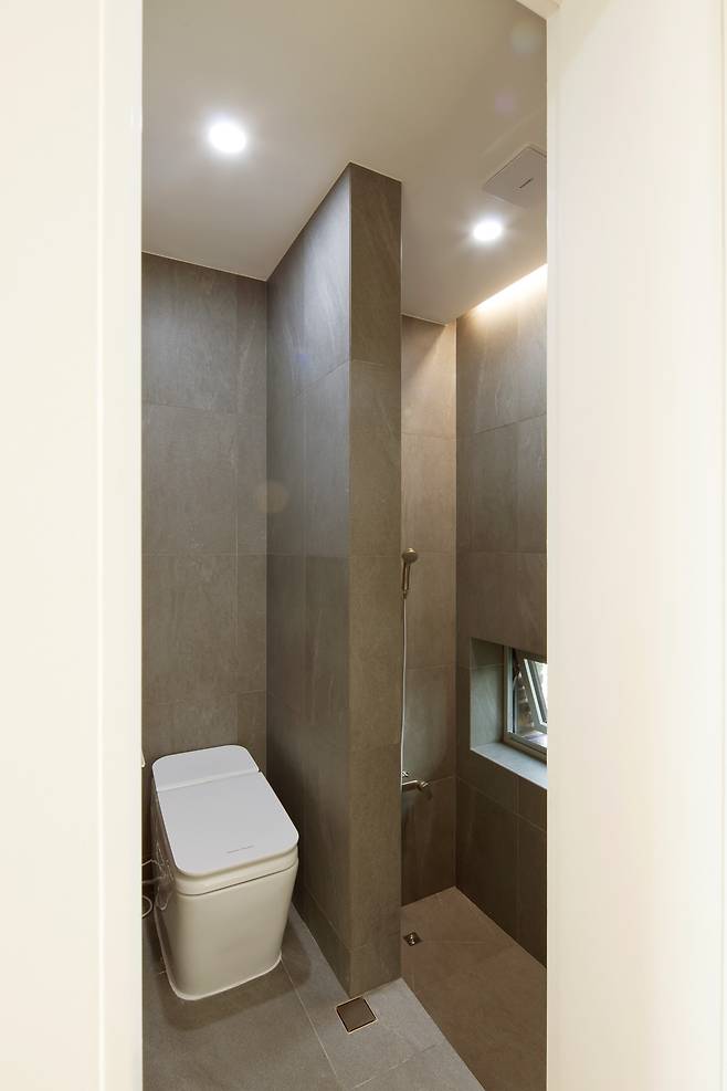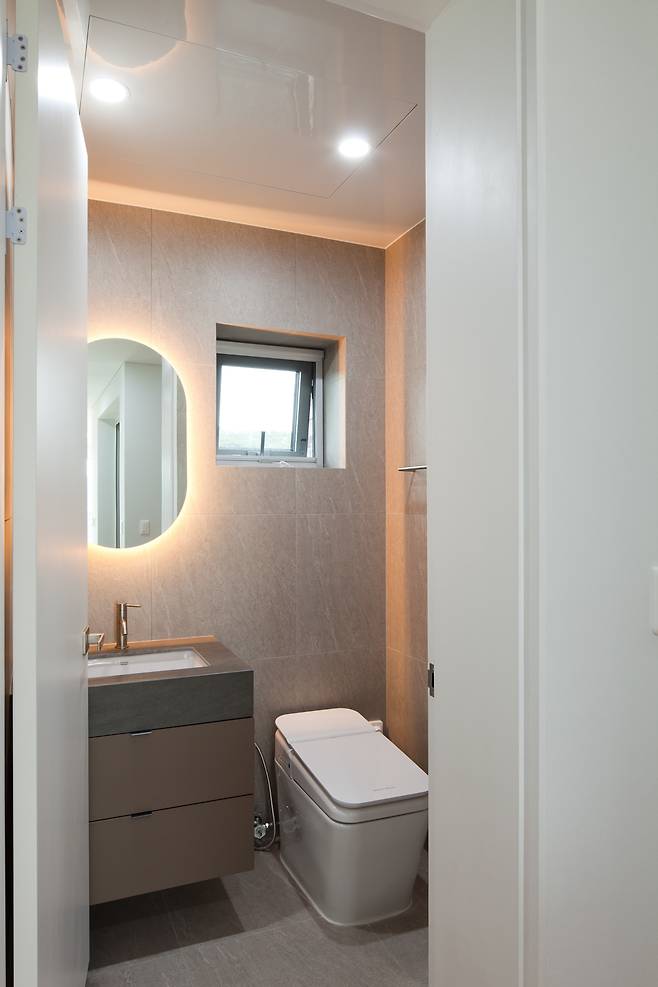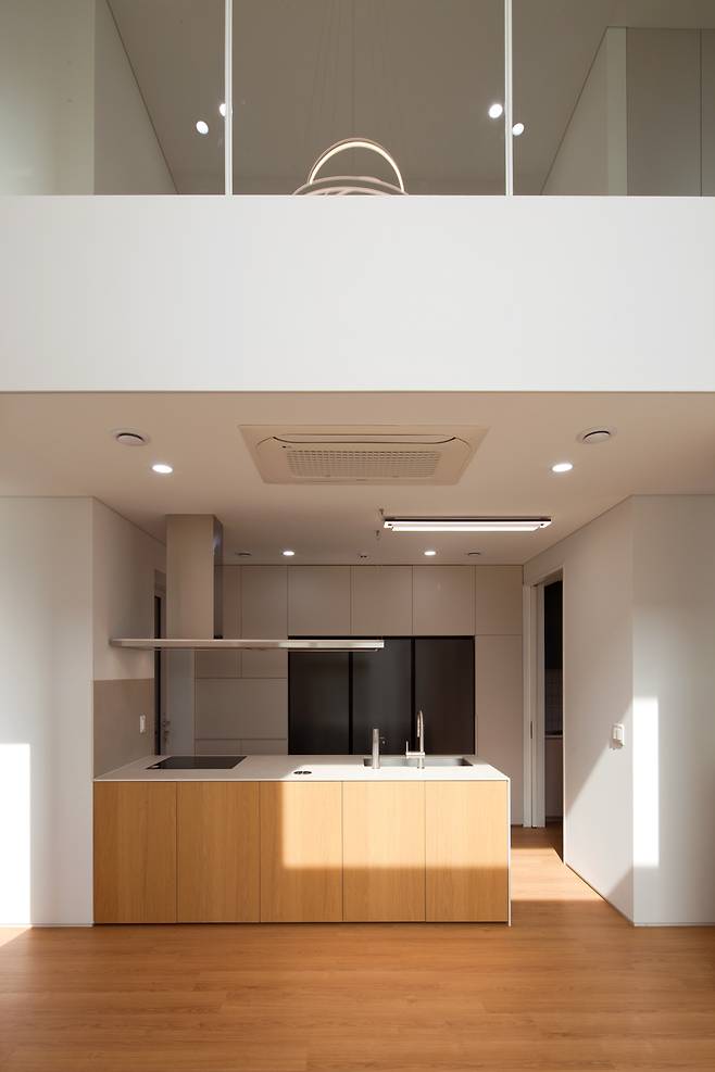 중간 영역은 비교적 차분한 공간으로, 손님과 함께 차와 다과를 즐길 수 있도록 1층에 주방, 식당을 배치했다. 공적, 사적 영역이 미묘하게 뒤섞인 이곳에선 각 실의 연결을 중점적으로 계획했다. 식당 상부를 오픈하여 2층 가족실과 연계하는 동시에 개방감과 쾌적함을 제공하고, 식당과 거실은 명확하게 분리되어 있지만 서로 마주 보는 방향으로 넓은 창을 내어 각각의 공간과 연계된다.