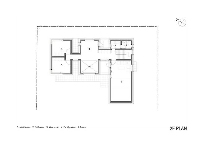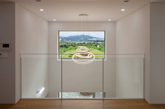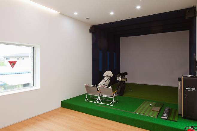 현관이 포함된 가장 큰 덩어리는 손님맞이와 취미생활을 위한 공간으로, 1층에 거실, 2층에 골프연습실(멀티룸)이 자리한다. 다양한 활동을 수용하도록, 매스의 높이와 길이를 확장하여 충분한 공간을 확보했다.