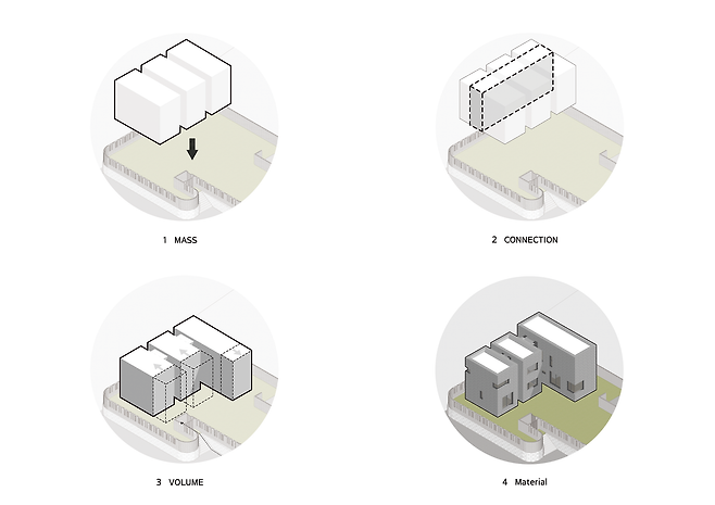 건물은 크게 3개의 덩어리로 나뉜다. 이들을 공간의 성격에 따라 가장 동적인 영역에서 가장 정적인 영역 순으로 평행하게 배치하였고, 각 영역 안에서는 공간이 수직적으로 나뉘지만, 유사한 성격의 공간을 매치시켜 일관성이 유지된다. 전이 공간으로써 공간을 연결하는 짤막한 중간 복도는 곳곳에 둔 창호를 통해 사이사이 재미있는 공간 전환을 일으킨다.