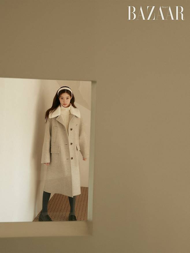 베이지 코트와 화이트 니트, 헤어 밴드로