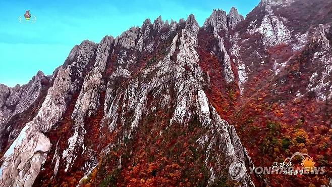 (서울=연합뉴스) 북한 조선중앙TV는 24일 드론을 이용해 붉게 물든 금강산의 가을풍경을 다양한 각도에서 촬영한 영상을 방영했다. [조선중앙TV 화면] 2023.10.24