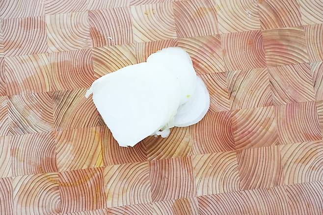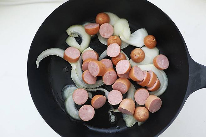 양파와 소시지를 넣어주세요 그리고 살짝 볶아주세요