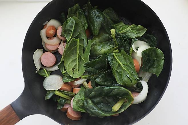 특히 시금치는 철분과 비타민이 풍부하고, 계란과 소시지를 통해 단백질까지 챙길 수 있어 영양 균형 면에서도 아주 훌륭한 한 끼가 되죠.