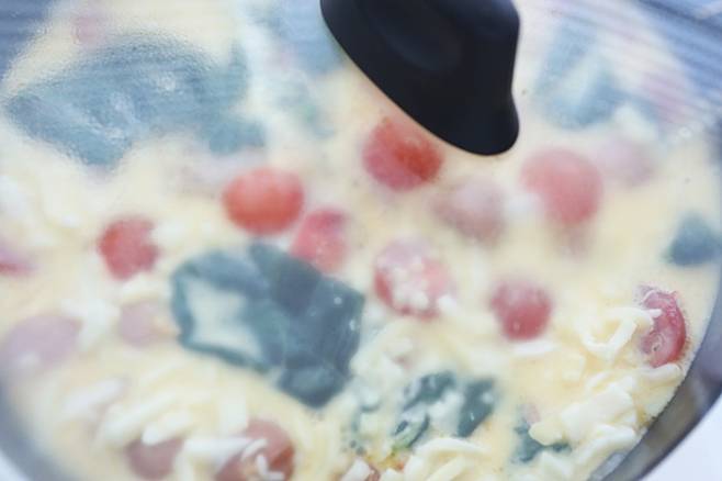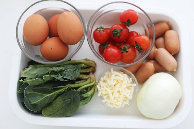 시금치 한 줌, 계란 4개, 방울토마토 10개, 소시지(비엔나 또는 일반 소시지 적당량), 양파 1/4개, 우유 100ml, 모짜렐라치즈 약간, 후추, 소금