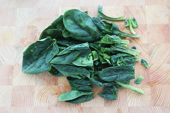 시금치는 깨끗하게 씻어 밑동을 제거하고 먹기 좋게 썰어줍니다.