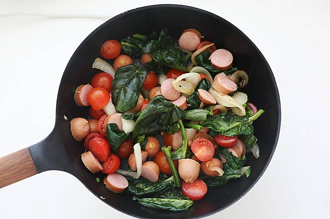 특히 따뜻하게 익은 토마토의 달큰한 맛, 소시지의 쫄깃함, 시금치의 향긋함이 계란과 잘 어울려서