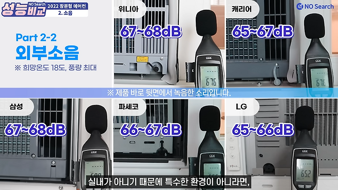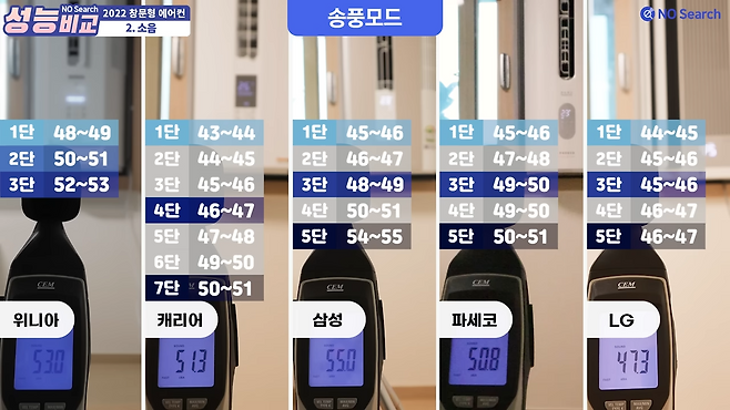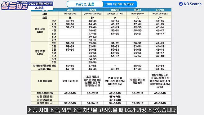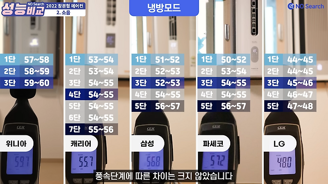 송풍, 냉방, 저소음모드 모두 엘지 제품이 가장 조용했으며, 위니아가 가장 소음이 컸습니다.
