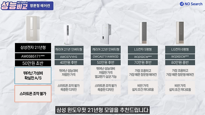 5개 브랜드의 제품들 중 가장 추천드리는 모델은 삼성 21년형 윈도우핏입니다.