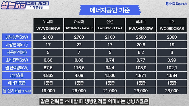 에너지 공단 데이터 기준 캐리어가 가장 냉방능력이 좋았으며, 전기요금은 위니아가 가장 저렴했습니다. 냉방면적은 5~7평으로 원룸이나 방 한칸을 시원하게 하는데 충분한 성능이었습니다.