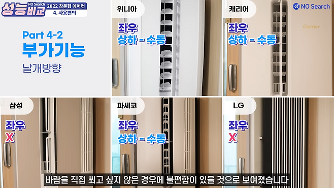 바람 토출구 방향은 삼성과 엘지가 상하 조절이 되지 않아 아쉬웠습니다.
