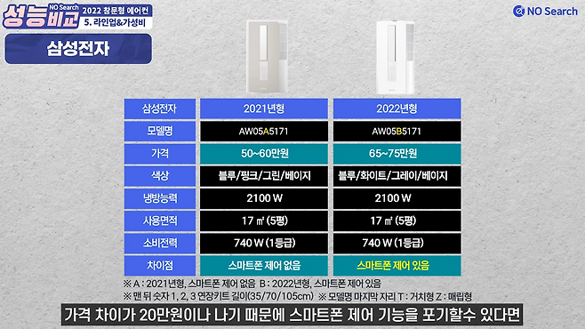 삼성은 21년형와 22년형이 있으며 차이점은 스마트폰 제어 기능 유무입니다. 다만, 가격이 10만원 가까이 차이나기 때문에 아직까진 21년형의 가성비가 좋아보입니다.