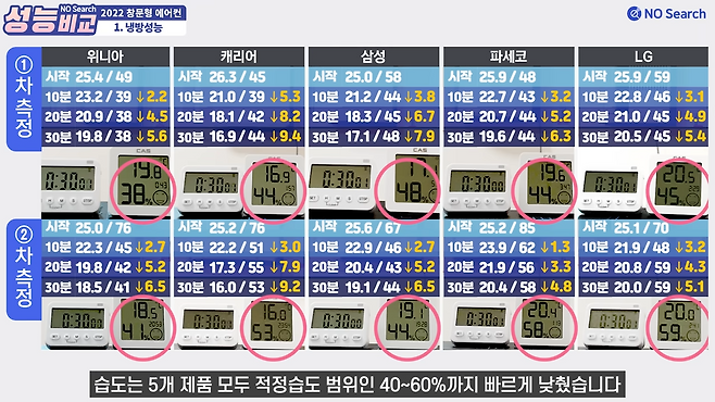 테스트에 쓰인 제품은 위니아, 캐리어, 삼성, 파세코, 엘지 총 5개 제품입니다.