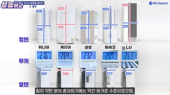 제품 무게는 캐리어와 엘지가 26kg으로 가장 무거웠고, 파세코가 20kg으로 가장 가벼웠습니다.