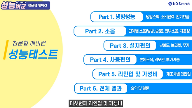 냉방성능, 소음, 설치편의, 사용편의 4가지 항목으로 테스트했으며