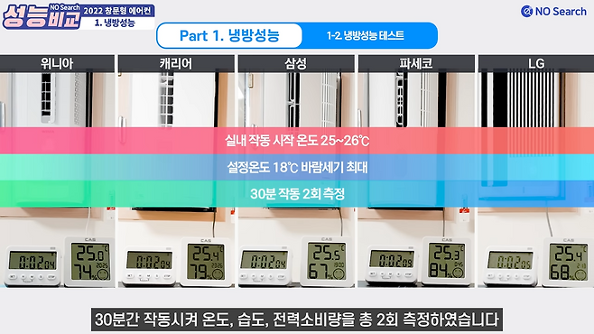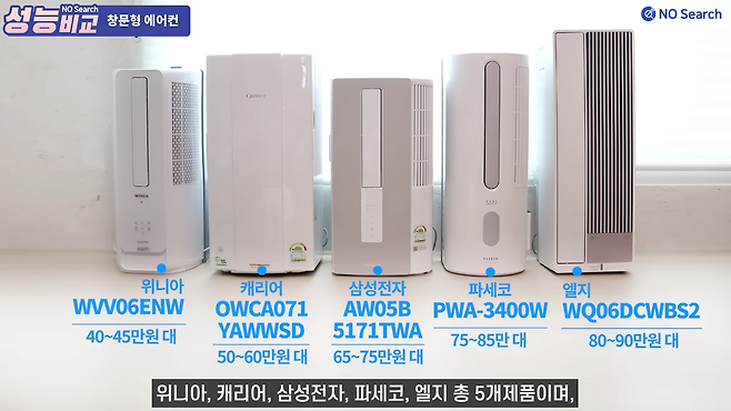 테스트에 쓰인 제품은 위니아, 캐리어, 삼성, 파세코, 엘지 총 5개 제품입니다.