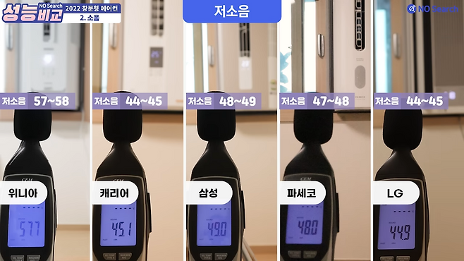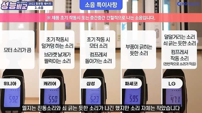 송풍, 냉방, 저소음모드 모두 엘지 제품이 가장 조용했으며, 위니아가 가장 소음이 컸습니다.