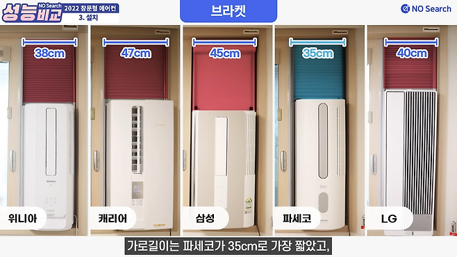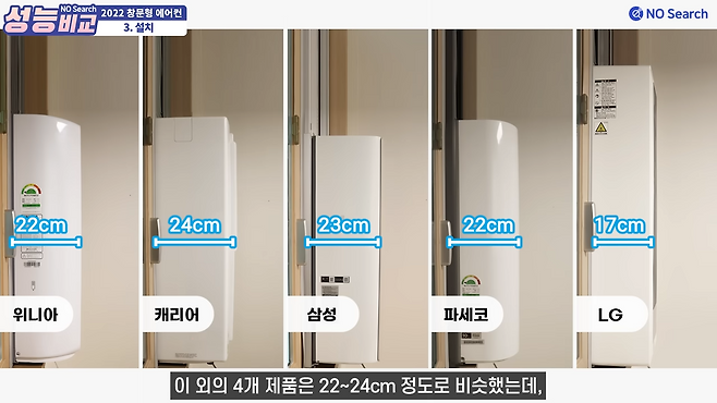 가로 길이는 캐리어가 가장 길었으며 엘지가 가장 슬림했습니다. 첫번재 창턱 설치 기준 캐리어가 가장 많이 튀어나왔으며, 엘지가 17cm로 슬림한 외관을 자랑했습니다.
