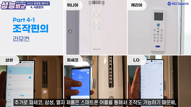 5개 제품 모두 리모컨을 본체에 부착할 수 있어 리모컨 분실 염려가 적었습니다. 삼성, 파세코, 엘지 제품은 스마트폰 제어 기능이 있어 더 편리했습니다.