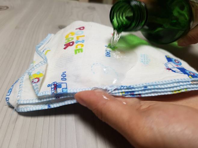 수건에 소주를 충분히 흡수하도록 부어주세요. 수건을 반듯하게 접은 상태에서 진행해 주셔야 구김 없이 잘 펴집니다.