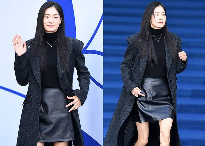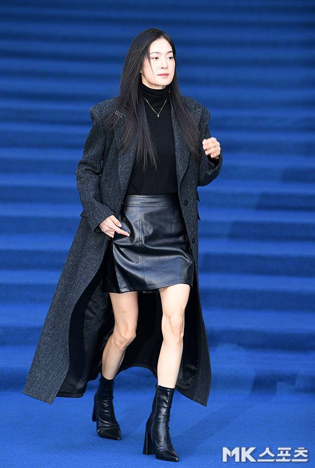 블랙 하이넥 니트에 가죽 미니스커트, 롱부츠까지 완벽한 ‘다크 시크’ 조합, 여기에 맥시 롱 코트까지 휘날리며 런웨이급 분위기를 연출했다.