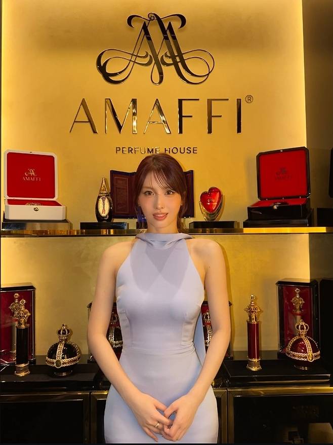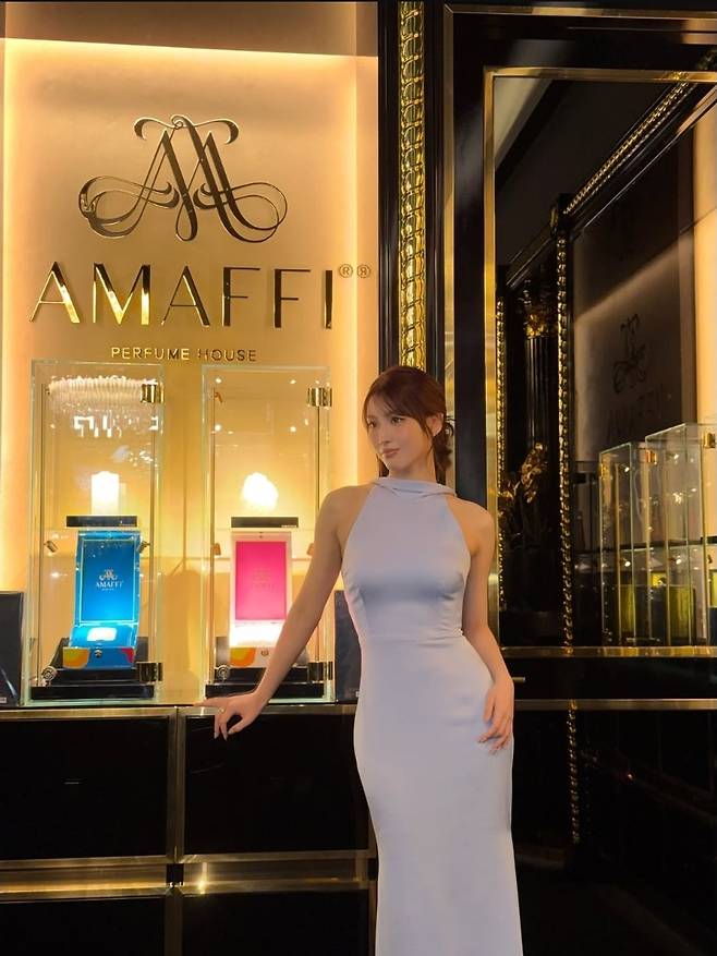 군더더기 없이 떨어지는 머메이드 라인의 딱붙핏 드레스는 모모의 늘씬한 바디라인을 더욱 돋보이게 했고, 화려한 조명 아래 반짝이는 실버 주얼리와 어우러져 우아함을 배가시켰습니다.