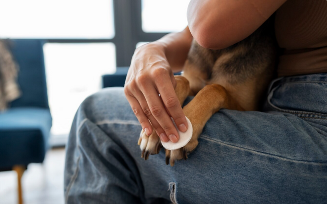 산책 후에는 미지근한 물로 꼼꼼하게 씻고, 마른 수건으로 닦은 뒤 드라이어로 발가락 사이까지 건조해야 한다. 발 전용 클렌저나 보습제도 소량만, 발가락 사이엔 절대 잔류 없이 사용하는 것이 원칙이다.