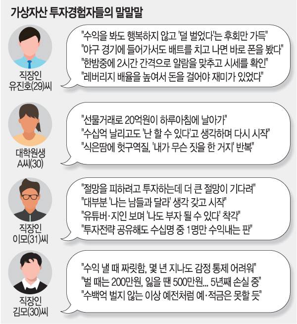 국민일보가 설문조사로 확인한 가상자산 투자자들의 평균적 인식은 ‘도박과 투기에 가깝고, 돈을 잃을 위험이 큰 게임’이었다. 인터뷰한 이들은 공통적으로 “다른 사람은 몰라도 나는 돈을 딸 수 있을 줄 알았다”고 말했다. 온 국민이 스마트폰을 갖고 있다는 점, 투기적 성향이 예로부터 강하다는 점 등이 한국인의 가상자산 열풍 요인으로 설명되기도 한다. 김대종 세종대 경영학부 교수는 “세계 주식시장에서 한국의 시가총액은 1.5%밖에 안 되지만, 선물과 옵션거래 금액은 한국이 세계 1위를 기록한 적이 많다”며 “자기 소득 범위 내에서 지출해야 한다”고 말했다. 이부형 현대경제연구원 경제연구실 동향분석팀장은 “누구도 보증하지 않는 곳에 자산 대부분을 쏟아붓는 건 굉장히 불합리한 선택으로 보인다”고 말했다.