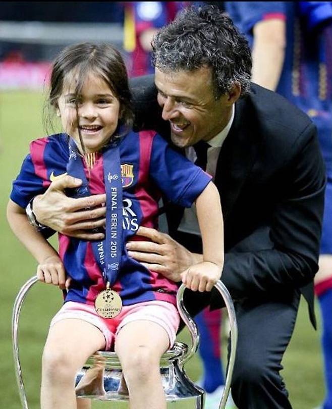 | “6년 전 세상 떠난 딸 매일 생각” 루이스 엔리케 파리 생제르맹(PSG) 감독(오른쪽)이 2014∼2015시즌 FC바르셀로나를 이끌고 유럽축구연맹 챔피언스리그(UCL) 우승을 차지한 뒤 딸 사나를 안고 함께 기뻐하고 있다. 사나는 9세이던 2019년 골육암으로 세상을 떠났다. ESPN 소셜미디어 캡처 |