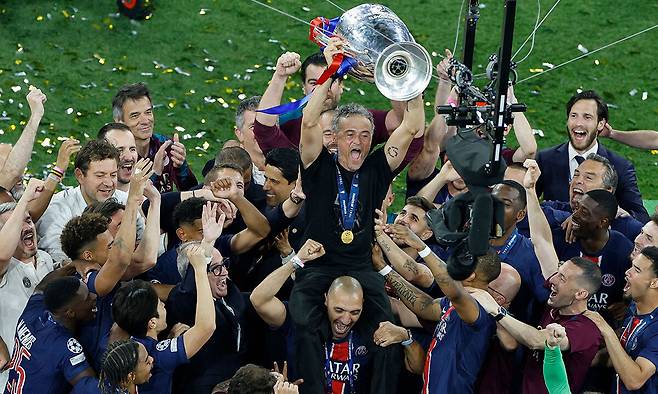 | 빅이어 ‘번쩍’ 루이스 엔리케 파리 생제르맹(PSG) 감독(가운데)이 1일 독일 뮌헨 알리안츠 아레나에서 열린 2024∼2025시즌 유럽축구연맹 챔피언스리그(UCL)에서 우승을 차지한 뒤 선수들과 함께 트로피를 들어올리며 환호하고 있다. 뮌헨=AFP연합뉴스 |