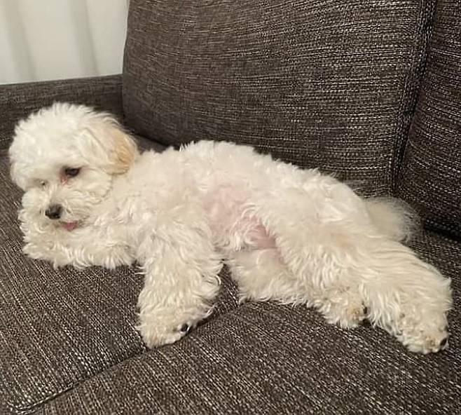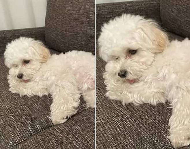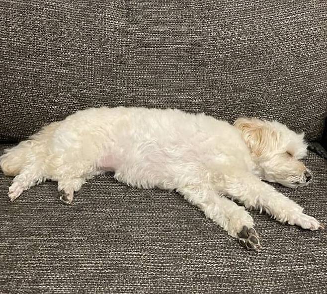 공개된 사진 속에는 신나게 뛰어놀아서 방전이라도 된 듯 치와푸 강아지가 소파 위에 누워있는 자세가 고스란히 담겨 있었는데요.