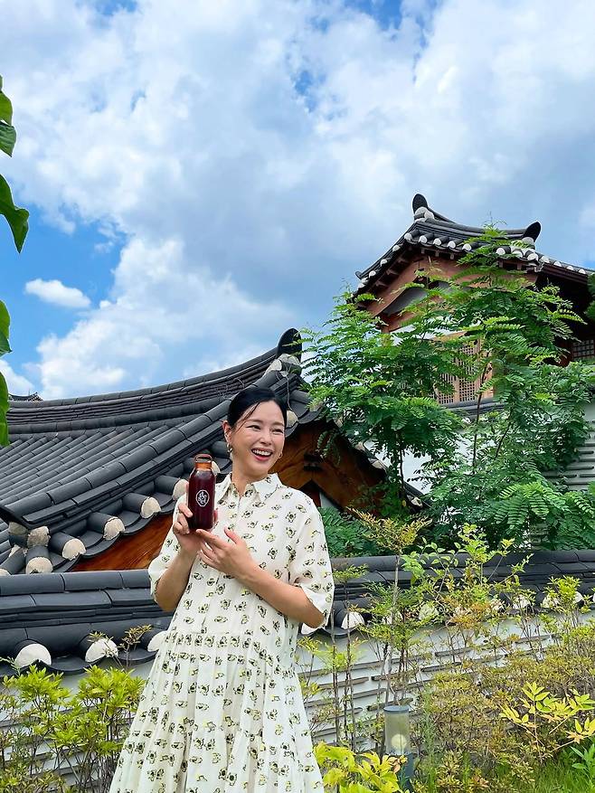 청량한 여름 공기가 흘러드는 한옥 마당, 전통 기와 아래로 스며드는 온화한 시간 속에서 한 여성이 환한 미소를 머금고 있다.