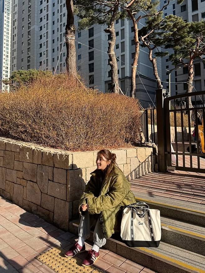 배우 강소라가 할머니 니트 카디건에 깔깔이 패딩 등원룩으로 털털한 미모를 드러냈다.