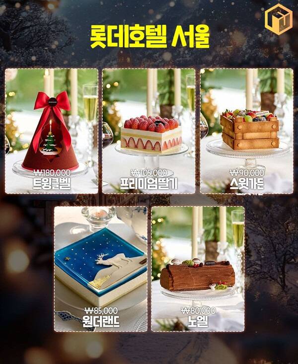 롯데호텔 서울과 월드는 따뜻한 감성이 가득 담긴 독특한 크리스마스 케이크를 선보였습니다. 트윙클벨은 종 모양의 초콜릿 안, 눈이 쌓인 트리와 커다란 리본 장식이 특징인데요. 통나무 장작을 연상케하는 노엘 케이크, 과일바구니를 연상케하는 스윗가든 케이크 등 8만원부터 18만원 가격으로 판매되고 있습니다.