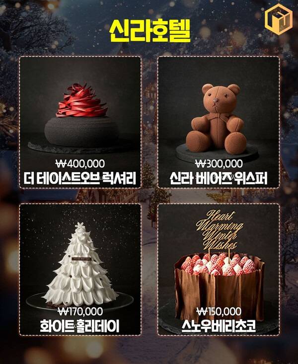 서울 신라호텔은 제과점 패스트리 부티크에서 크리스마스 케이크를 판매합니다. 화제가 되었던 초고가 케이크의 정체는 바로 '더 테이스트 오브 럭셔리 케이크'로, 40만원에 달하는데요.