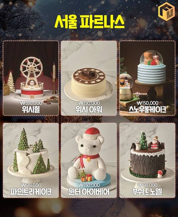 그랜드 인터컨티넨탈 서울 파르나스는 2024 크리스마스 시즌을 기념해 13종의 케이크를 판매합니다. 최고가 케이크인 '위시 힐'은 35만원의 가격과 구성으로 한 차례 화제가 되었는데요. 대관람차로 형상화한 초콜릿 아트 쇼피스가 올라간 케이크로, 실제로 대관람차 바퀴가 회전해 예술적 완성도를 자랑합니다.
