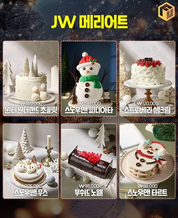 JW 메리어트 호텔 서울의 델리 부티크 ‘파티세리’의 크리스마스 케이크는 럭셔리한 감성이 담겨있는데요. 시그니처 케이크인 '윈터 원더랜드 초콜릿'은 14만원으로, 초콜릿 케이크를 화이트 디자인으로 덮어 설원을 표현한 케이크입니다. 이외에 스노우맨 무스 케이크, 스노우맨 시크릿 피니아타, 스노우맨 스트로베리 생크림 케이크, 부쉬 드 노엘 등 눈을 연상케한느 크리스마스 케이크가 출시되었습니다.