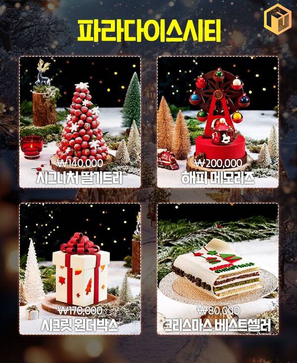 파라다이스 호텔앤리조트의 크리스마스 케이크는 관람차, 선물 상자, 트리 등 성탄절 상징을 구현해 특별함을 자랑합니다. 생딸기가 듬뿍 쌓인 '시그니처 딸기 트리'와 대관람차를 형상화한 '해피 메모리즈', 꿀이 가득한 '시크릿 원더박스', 시트를 겹겹이 쌓아 책을 표현한 '크리스마스 베스트셀러' 등인데요. 가격은 8만원부터 20만원까지로 다양합ㄴ디ㅏ.
