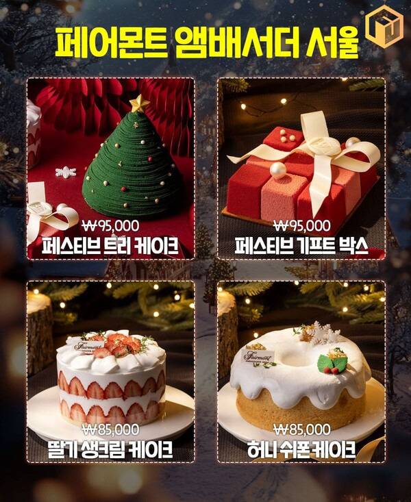 페어몬트 앰배서더 서울이 크리스마스를 테마로 한 이색 케이크 6종과 조각 케이크 7종, 쿠키 등을 선보였습니다. 호텔 1층의 더 아트리움 라운지에서 판매되는 크리스마스 케이크는 네이버 예약을 통해 사전 주문이 가능하며 11월 28일부터 12월 31일까지 현장 및 사전예약 구매가 가능합니다.