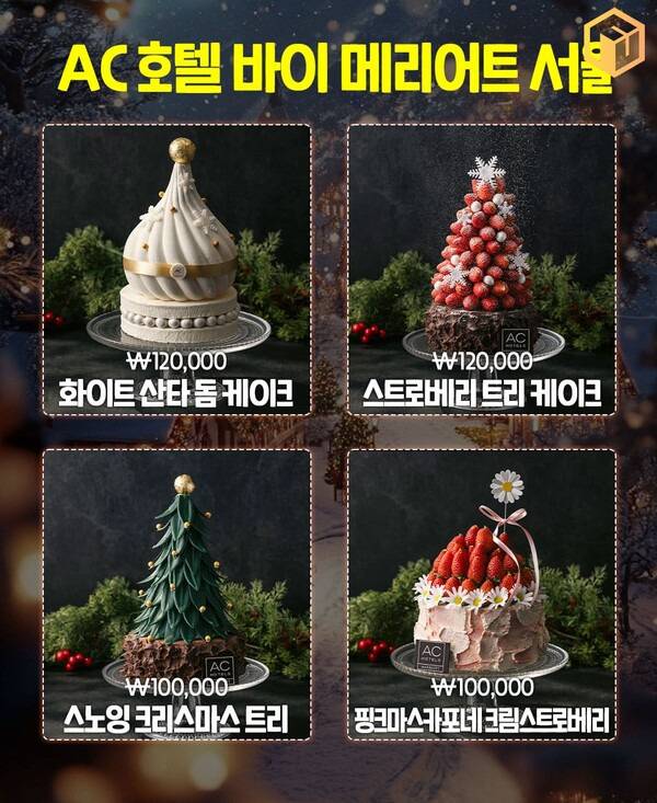 AC 호텔 바이 메리어트 서울 강남의 AC 키친에서는 화이트 크리스마스를 맞이해 다양한 크리스마스 트리 케이크를 선보였습니다. 특히 화이트 산타 돔 케이크는 12만원의 가격이며 하루에 단 1개만 한정으로 판매됩니다. 스노잉 크리스마스 트리 케이크, 핑크마스카포네 크림스트로베리, 스트로베리 트리 케이크 등 모두 트리를 연상케하는 디자인이 특징입니다.