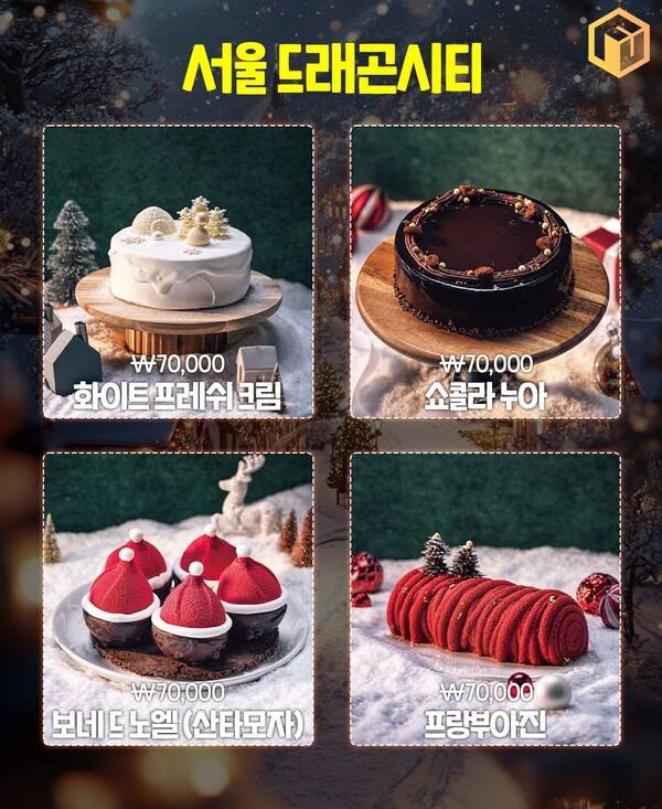 서울 드래곤시티 크리스마스 케이크 6종은 수령일 2일 전까지 예약해야 구입이 가능한데요. 현장 구매는 11월 29일부터 12월 25일까지 가능하며, 네이버와 공식 홈페이지, 유선 예약 또한 가능합니다.