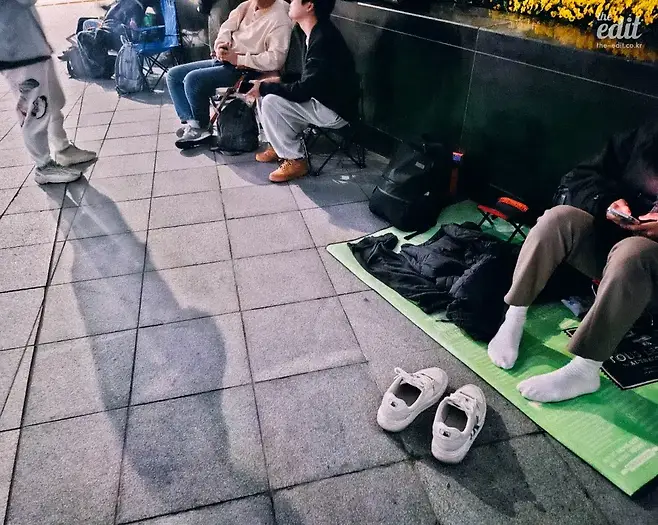 12시부터 5시까지는 건물 지하 2층 문이 닫혀. 그래서 더현대 정문 야외 화단에 일렬로 대기해야 한대. 미리 서 있던 줄 순서대로 그대로 나가서 동일한 순서대로 화단 옆에 쪼르륵 자리를 잡아야 해. 이 방식에 대해서는 더현대 보안 요원이 수시로 와서 친절하게 설명해 줬고, 기다리는 사람들도 질서정연하게 따라서 어려울 건 없었어.